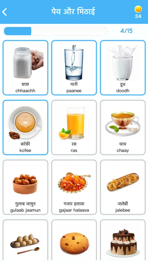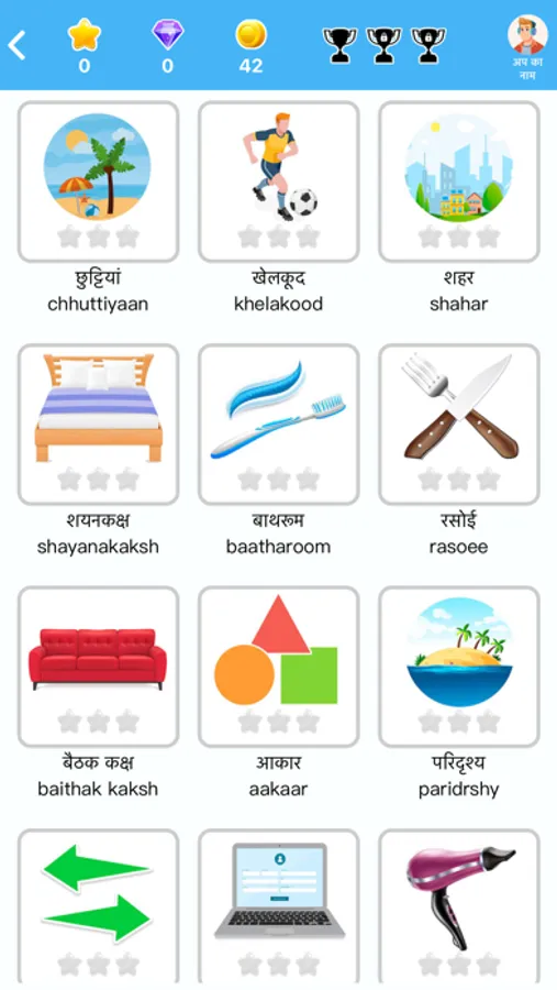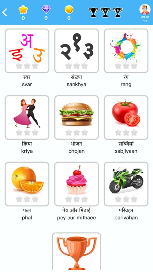 Basic: Alphabet letters , Numbers , Colors , Verbs , Food …