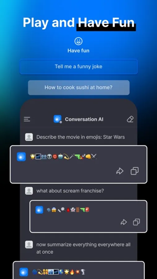 But that's not all. Conversation AI is also a great companion for creative tasks, such as fiction writing, design projects, and even business presentations and marketing copies. With its ability to generate ideas, provide feedback, and offer suggestions, our chatbot can help you take your creativity to the next level.
