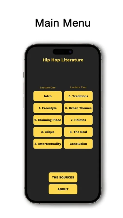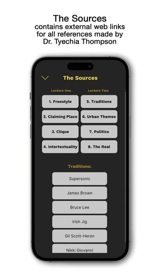 This course explores some key aesthetics and some aspects of the philosophy and culture of Hip Hop. After each lesson, this course also features quizzes for Virginia Tech students to evaluate their knowledge. "The Sources" contains references made by Dr. Tyechia Thompson in this course. These AR lectures adopt new approaches to teaching and learning using technology.