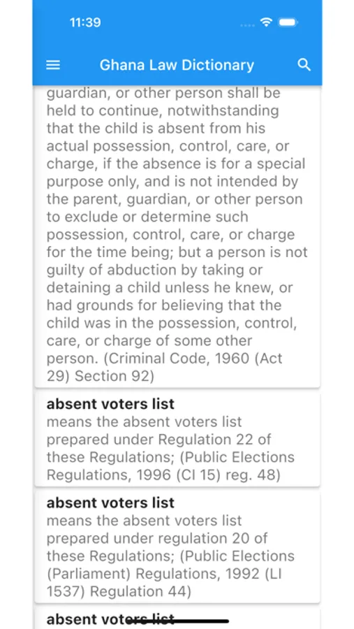 A simple layout aimed to create a dictionary for the lawful meaning of words, at least in Ghanaian law, A collection of Acts of the Republic of Ghana and the Ghanaian Constitution. All in one app and it is free of charge and has no annoying adverts. An added bonus is that this dictionary is unique in that it also references the Acts, Bills, and Executive and legislative instruments where the words are used in their context.