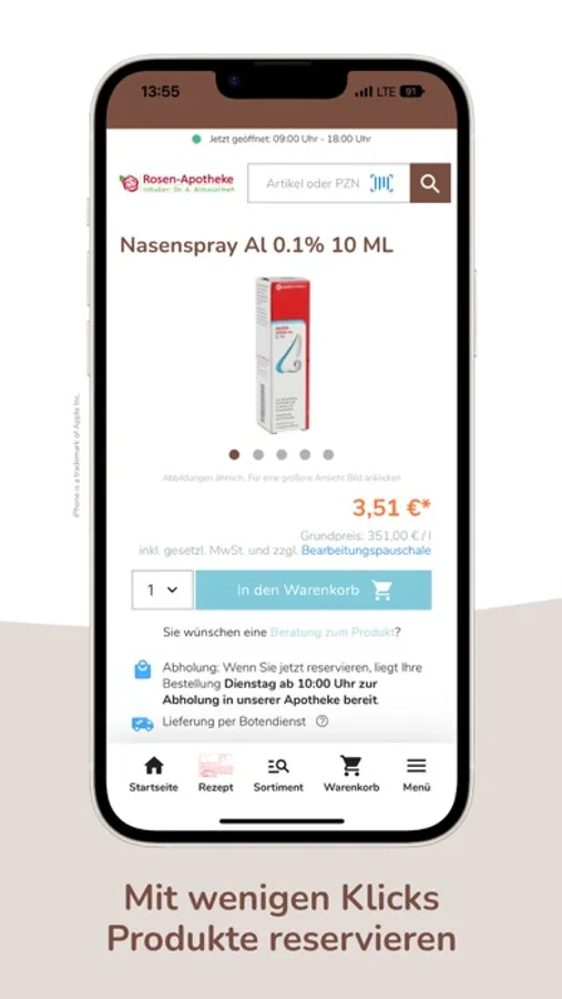 Bitte beachten Sie, dass wir bei apothekenpflichtigen Produkten zu einer pharmazeutischen Beratung verpflichtet sind. Die Beratung findet entweder bei der Abholung bei uns in der Apotheke, bei der Übergabe bei Ihnen zu Hause oder telefonisch statt.