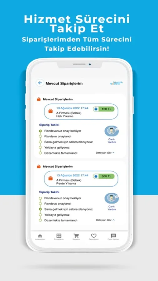 Temizlik Express sayesinde temizlik artık sorun olmaktan çıkıyor . Kayıtlı adresinizi seçerek , ödeme yönteminizi belirtilerek , geçmiş ve anlık siparişlerinizi görerek , beğenilen firmaları favorilere alarak , kampanyalardan , bildirimler sayesinde haberdar olarak hayatınıza sayısız kolaylık sağlamayı ön gören bir kuruluş olarak hizmetinizdeyiz .