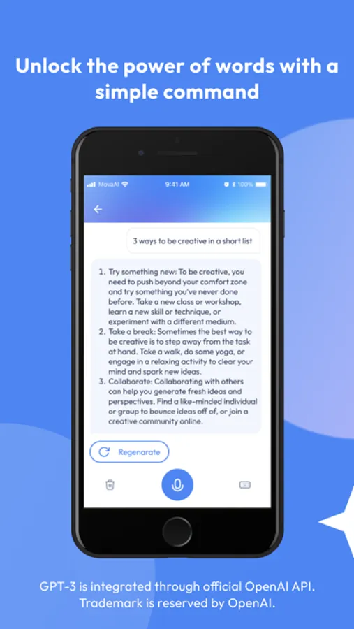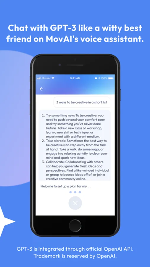Get ready to revolutionize the way you interact with your device with MovAI - the ultimate voice assistant app. With just a few words, MovAI's intelligent algorithms respond with highly accurate and personalized responses, thanks to the powerful GPT technology. Plus, the more you use MovAI, the smarter it gets! This app adapts to your preferences and becomes more efficient, making your experience seamless and hassle-free. Say goodbye to clunky interfaces and hello to effortless voice commands with MovAI.