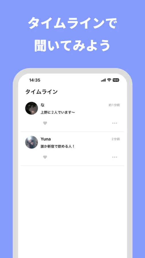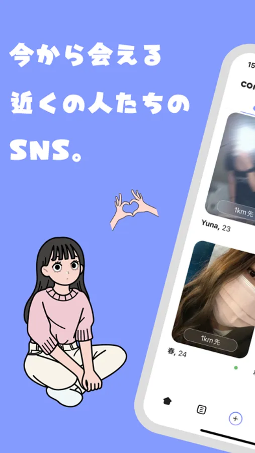友達と遊んでいる休日でも、野球観戦が終わった後の飲みでも、1人で暇している時でも、仕事帰りにちょっとだけ空いた時間でも、いつでも新しい人と会えるようなアプリです!