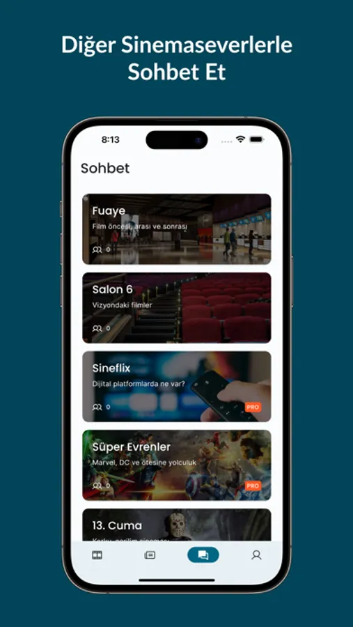 - Talk to other movie lovers in topic-specific chat rooms, discuss recent news (some rooms are for PRO members only)