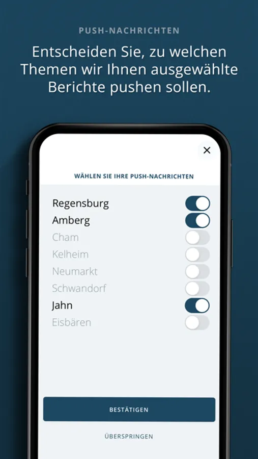 • Im zweiten Schritt entscheiden Sie sich für Regionen und/oder Themen, zu denen Sie Push-Nachrichten direkt auf Ihr Mobilgerät wünschen. Die Auswahl lässt sich unter „Einstellungen“ (rechts oben neben dem Logo) jederzeit ändern.