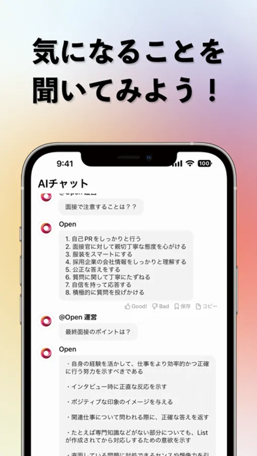 「面接で気をつける点」などの質問はもちろん、自分の強みや経験を元にしたアドバイスなども出力が可能です。