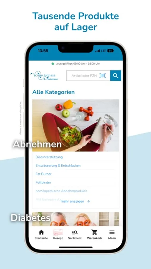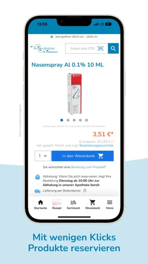 Wir bieten Ihnen über die App unser gesamtes Sortiment. Nicht sofort verfügbare Produkte bestellen wir für Sie und machen Sie in der Regel bis zum nächsten Werktag abholbereit. Gerne liefern wir Ihnen Ihre Bestellung per Botendienst direkt nach Hause.