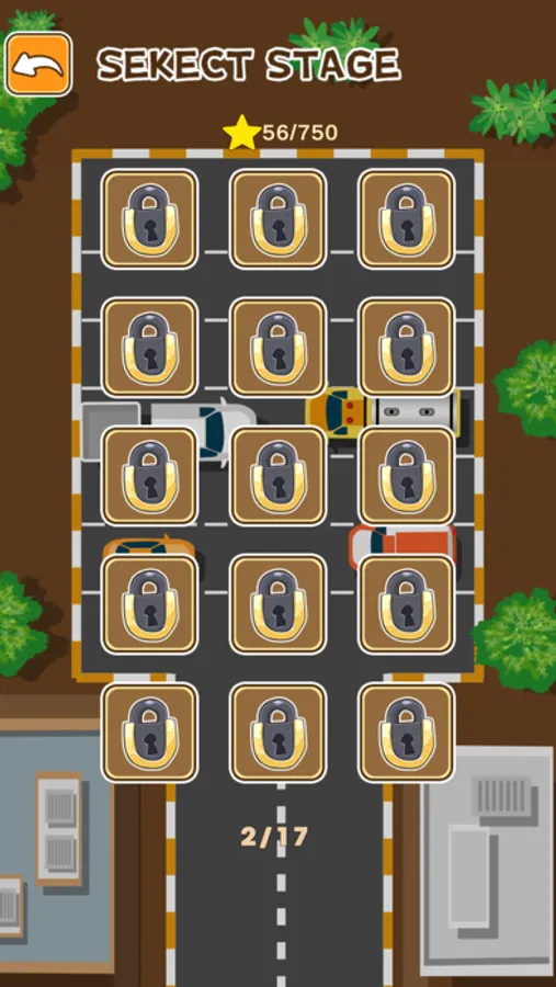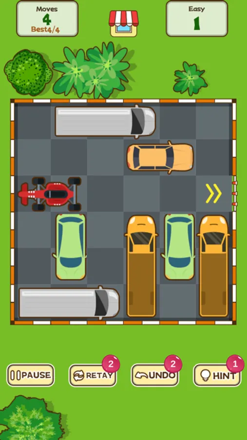 This is the beginning of the puzzle game. Push away all the yellow cars and let the red cars leave the parking lot. As usual in puzzle games, there is a limit to the number of steps each yellow car can move.