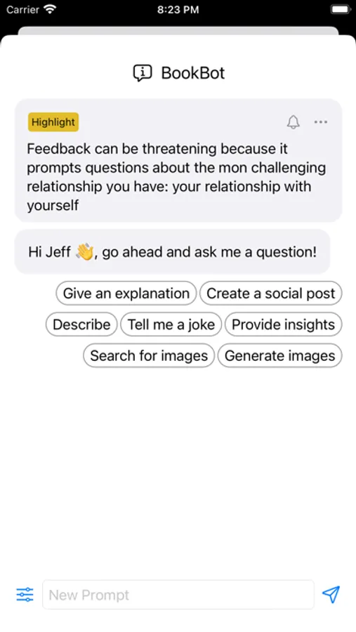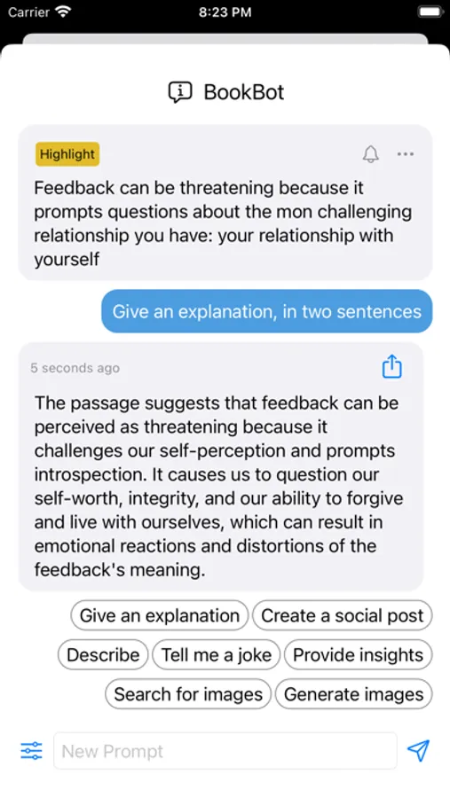 - BookBot will answer any questions, create a social post, or create a joke about any piece of text or page from your book.