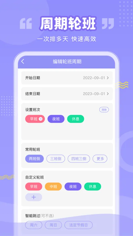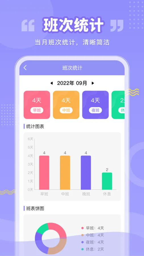 智能排班表,是一款专门为倒班、值班工作人群设计的软件。支持手动和周期两种排班方式快速生成自己的工作专属班次日历,设置依据不同班次自动响铃的轮班闹钟,为每一天添加特定备注提醒自己。界面清爽,交互简单,排班一目了然。复杂的排班周期计算和每天手动设置系统闹钟再也不会成为困扰的问题。