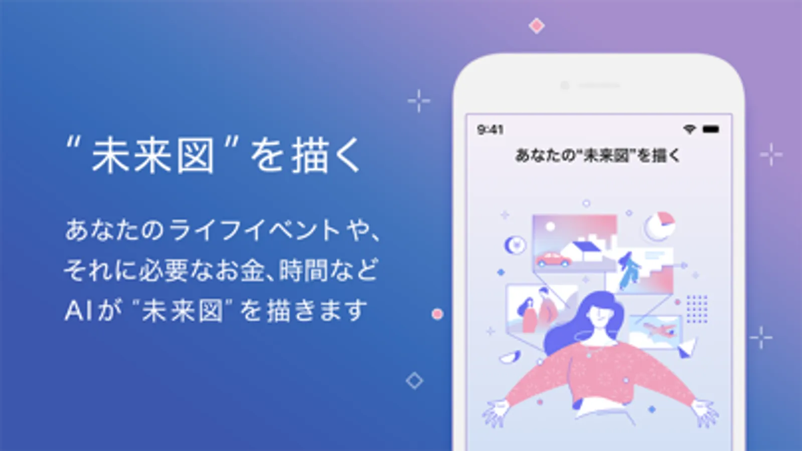 あなたのライフイベント、それに必要なお金、時間など、AIであなたの“未来(ミライ)図“を描いたりもできます。