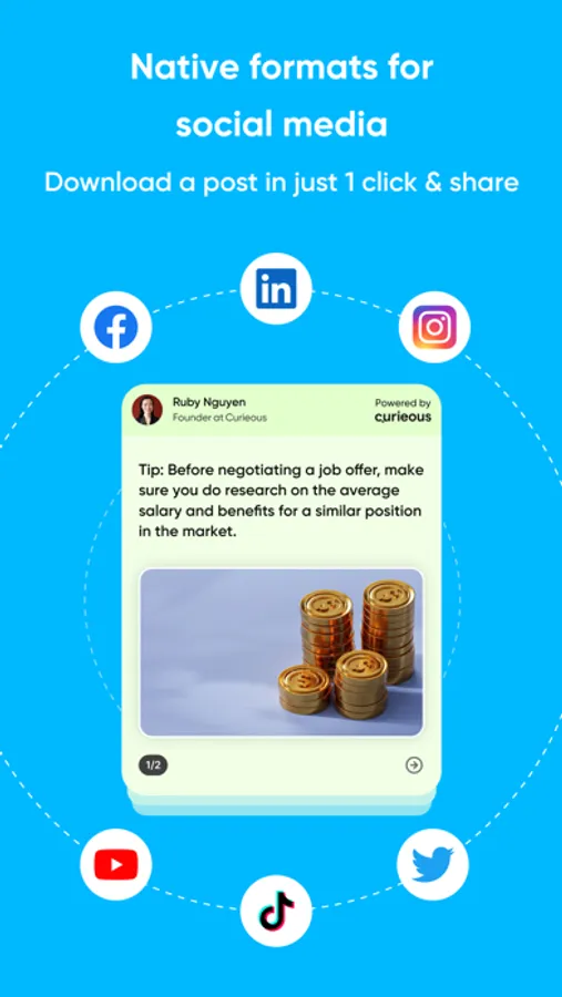 • Download to cross-post to other social media instantly in native formats (Photos for Facebook/Instagram, PDFs for LinkedIn, TikTok videos). Enhance engagement, and boost your audience reach 2X to 10X within weeks. No design needed, NO additional tools, HUGE time saver, and HUGE convenience!