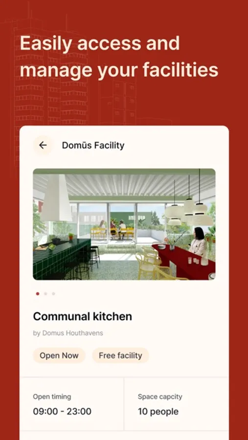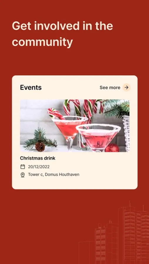 Community: Get in touch with your neighbours. The Domus app is a great way to connect with your neighbours and learn more about them. Whether it's through social events like New Year's drinks or workshops, the app helps you stay in touch with the community and get to know your neighbours better.