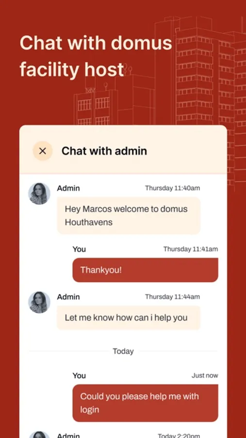 Chat: Any questions about the city? Your apartment? Chat with the facility manager about anything you want.