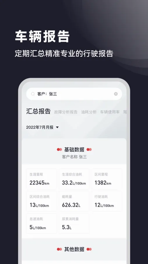 车辆报告:故障报告,油耗报告,车辆使用率报告,驾驶行为报告;