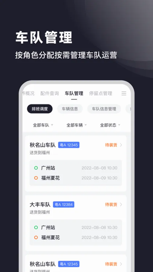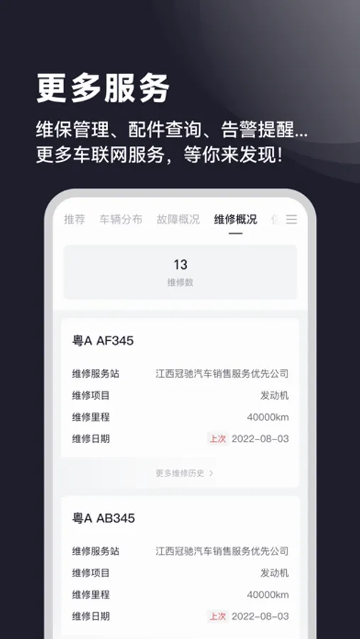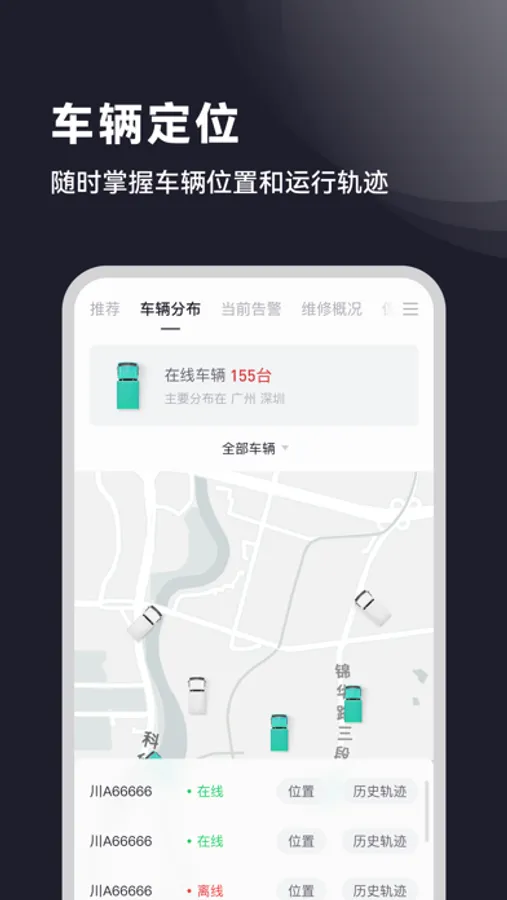 首页:厂家资讯、车辆分布、当前告警、维修概况、保养概况、配件查询、车队管理、停留点管理、成本与收益测算;