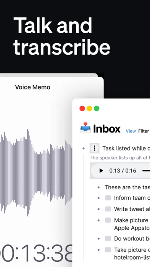 Take pictures or record videos and instantly send them to your inbox in your workspace. Document your progress or capture inspirational moments right at your fingertips.