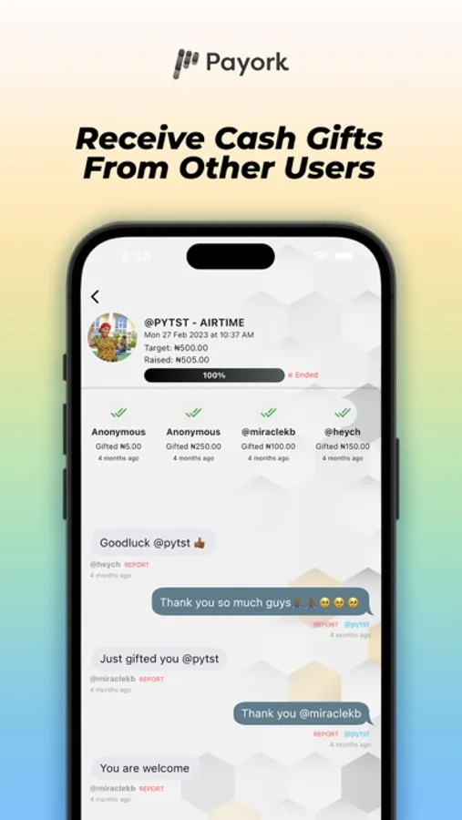With Payork, managing your finances is a breeze. Fund your wallet seamlessly by transferring from any bank using your unique virtual account number, conveniently accessible on your profile page. Furthermore, enjoy the instant gratification of sending and receiving cash gifts with just a few taps.