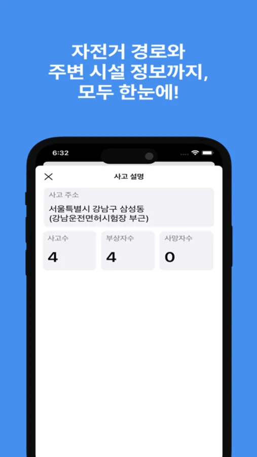 사고다발지역 정보뿐만 아니라, 해당 지역의 자전거 경로와 주변 자전거 시설 정보도 제공하여 자전거 이용에 도움을 줍니다.
