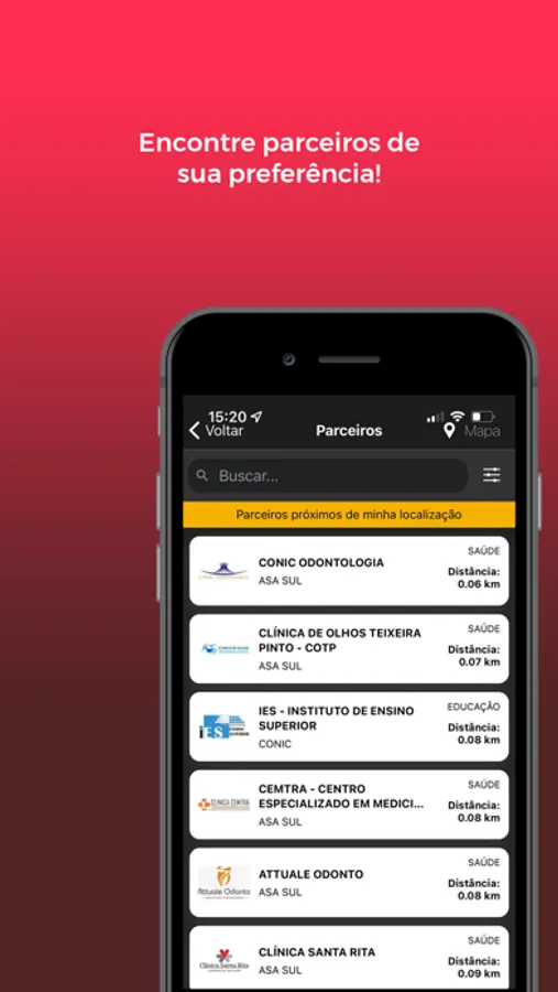 Busca de parceiros através do geolocalizador, filtragem personalizada para as buscas de empresas parceiras, acesso ao cartão virtual para utilizar os descontos, acesso a notícias e além do SAC para atendimento.
