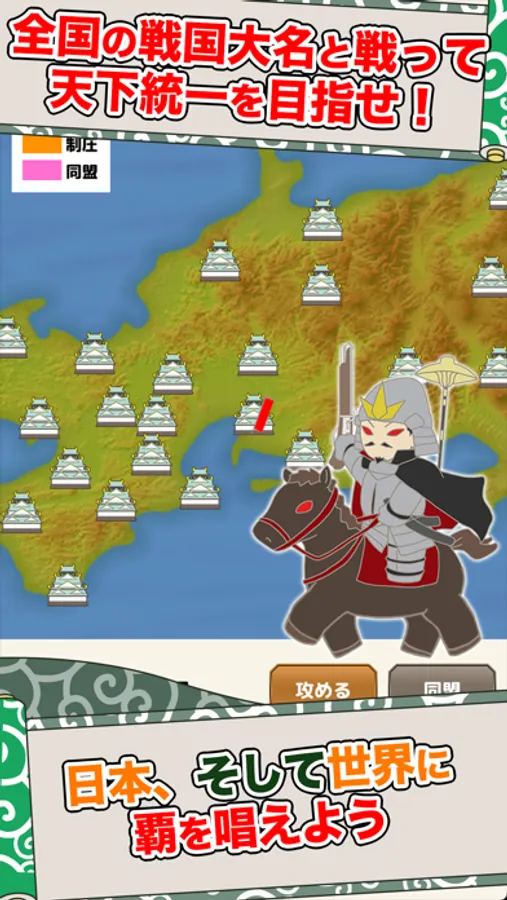 織田信長、徳川家康、武田信玄、上杉謙信、毛利元就、北条氏康、島津義久、伊達政宗、真田昌幸、長宗我部元親、大友宗麟、龍造寺隆信、最上義光といった群雄割拠している敵達を倒し、あなたの村が天下統一を果たすことができるのか!?