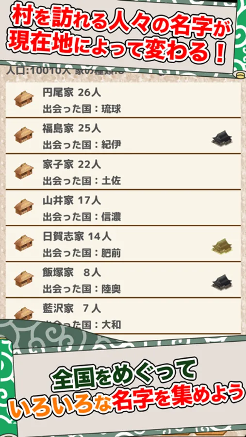 端末の位置情報から、その地域に見られる名字の人々が村にやってきます。全国各地をめぐり、いろいろな村人を集めましょう。