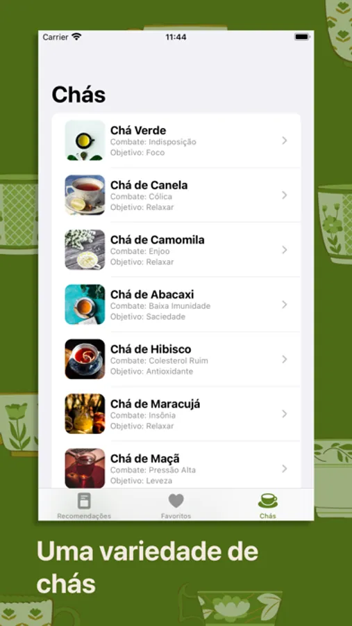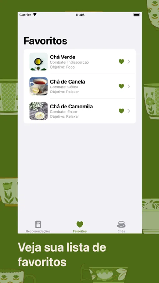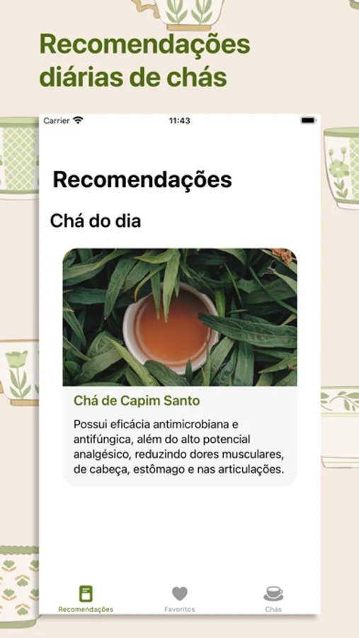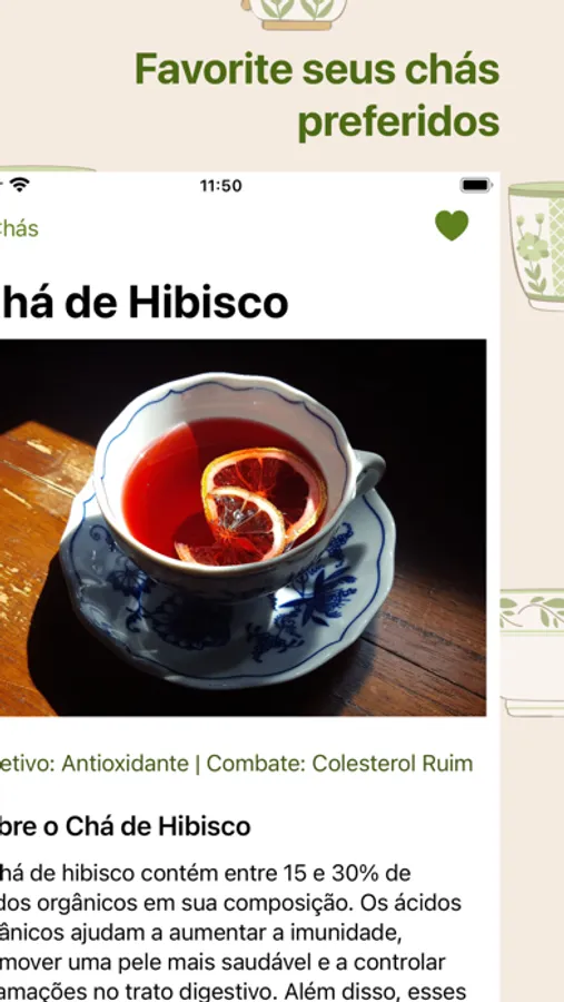 Aplicativo para os amantes e os curiosos sobre chás e infusões. Tenha acesso á receitas, seus benefícios e objetivos que possam promover um bem estar ao usuário. Caso queira pode favoritar os seus chás prediletos para ter sempre a sua disposição. O Hora do chá também contem a funcionalidade de trazer diariamente recomendações de chás para você experimentar.
