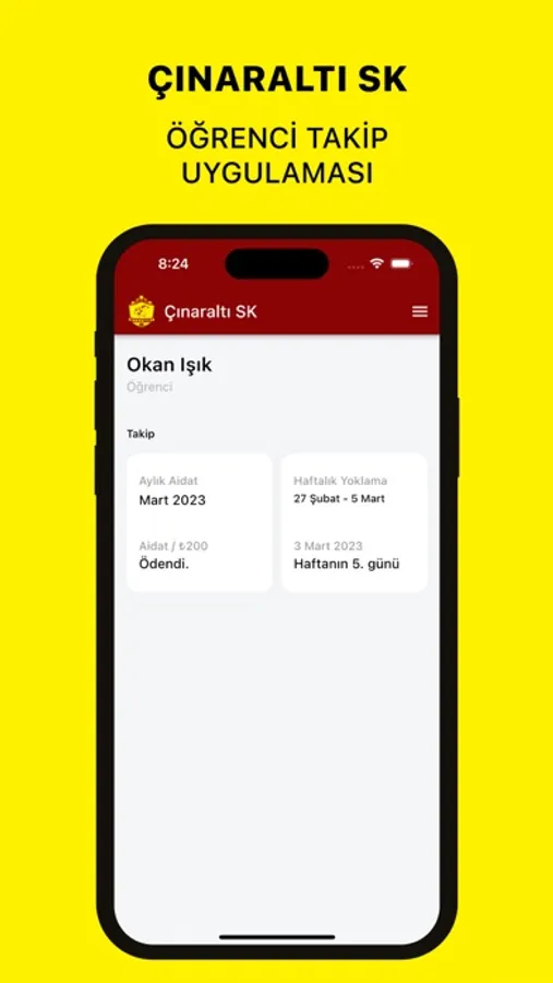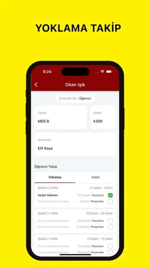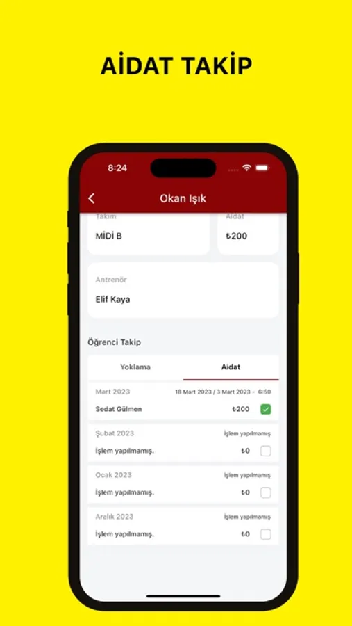 Bu sürümde yöneticiler ve antrenörler, öğrencilerin aidat ve yoklama takibini yapabiliyor. Öğrenciler ve veliler, öğrencinin kendine ait aidat ve yoklama durumunu takip edebiliyor.