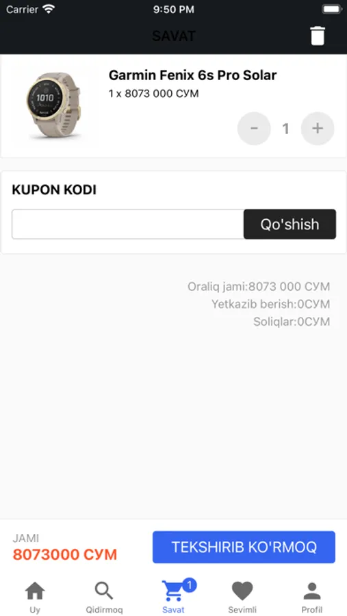Online tovarlarni sotib olish uchunn mobil ilova. Foydalanuvchilarga xarid buyurtmasini yaratish, to'lov usulini tanlash va buyurtmani Internetda yetkazib berish imkonini beradi. Kerakli tovarlar yoki xizmatlarni tanlagandan so'ng, foydalanuvchi odatda mobil ilovaning o'zida to'lov va etkazib berish usulini tanlash imkoniyatiga ega.