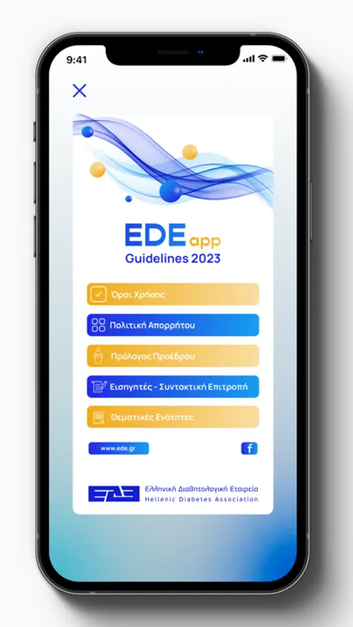 Η εφαρμογή EDE Guidelines περιλαμβάνει κείμενα και γραφικά, τα οποία βασίζονται στις Κατευθυντήριες Οδηγίες της Ελληνικής Διαβητολογικής Εταιρείας και απευθύνονται αποκλειστικά σε επαγγελματίες υγείας.