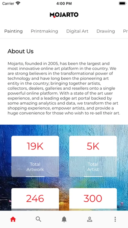 Mojarto is the largest and most innovative online art platform in the country. We are strong believers in the transformational power of technology and have long been the pioneering art entity in the country; bringing together artists, collectors, dealers, galleries and resellers onto a single powerful online platform. With a state-of-the-art user experience, and a leading-edge art portal backed by some amazing analytics and data, we transform the art shopping experience and empower artists