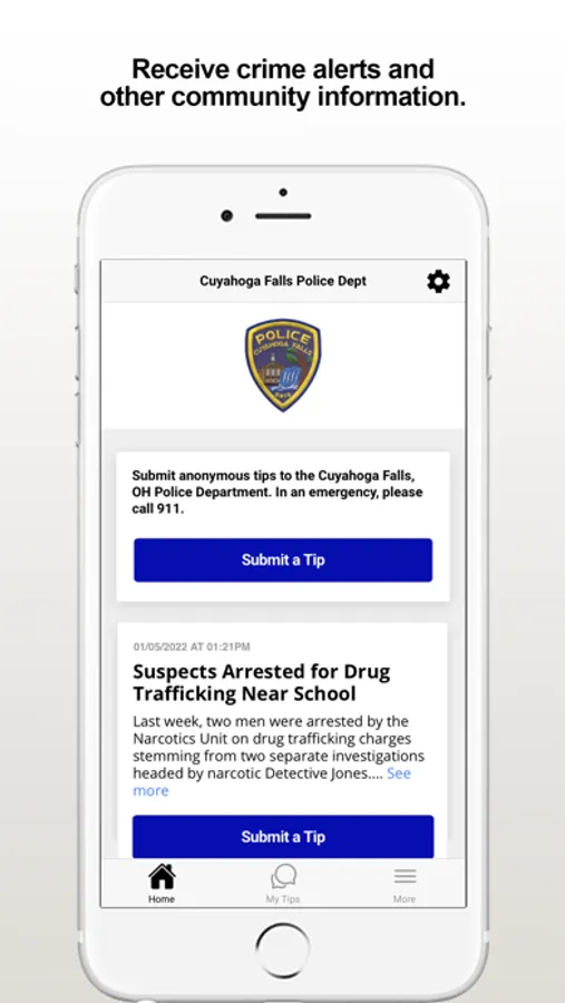 The Cuyahoga Falls PD app provides citizens the ability to submit anonymous tips to the Cuyahoga Falls, OH Police Department. The app also displays agency crime alerts and other organization web and social media content.