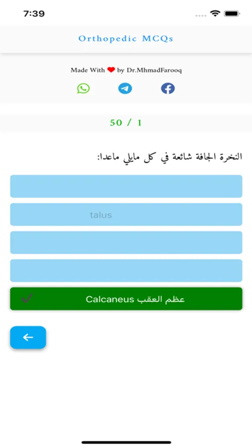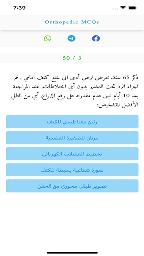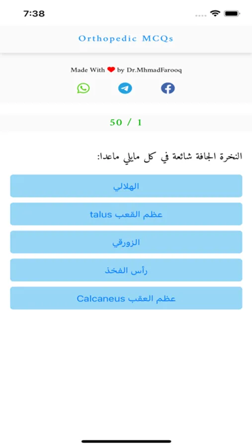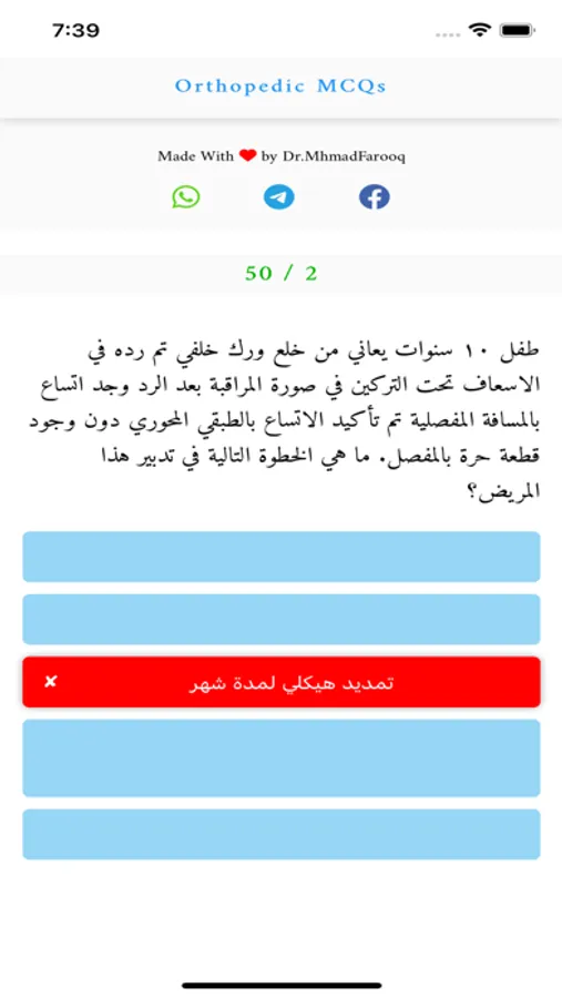 تطبيق يحتوي على العديد من الاسئلة متعددة الخيارات باللغة العريبة والخاصة بالجراحة العظمية, وهو موجه للمقيمين والاخصائيين لتقييم معلوماتهم في الجراحة العظمية.