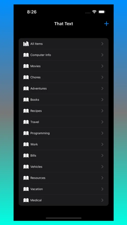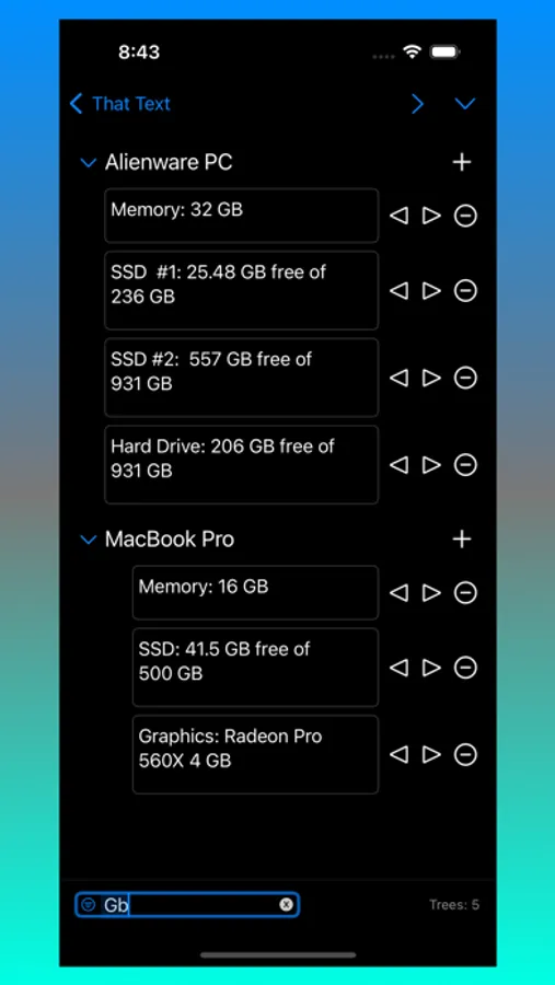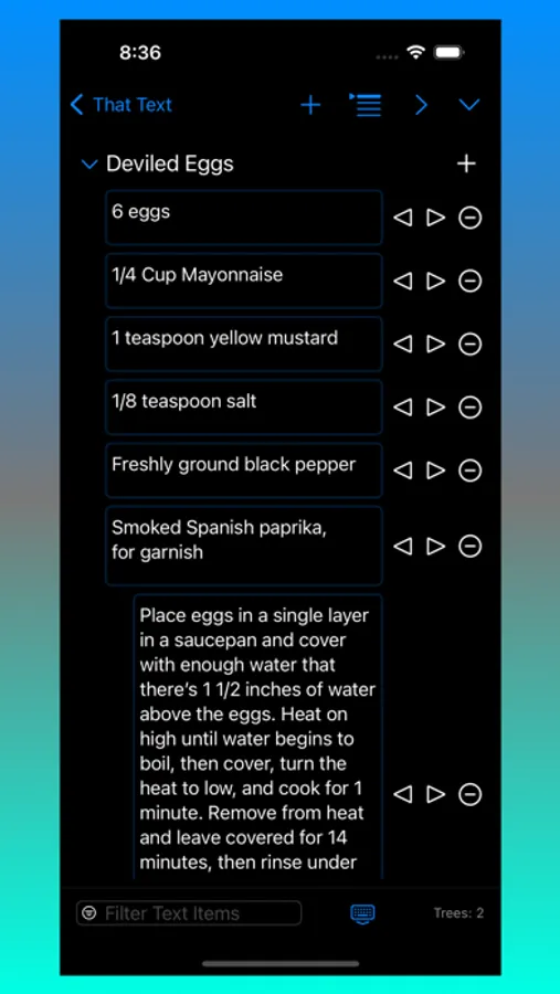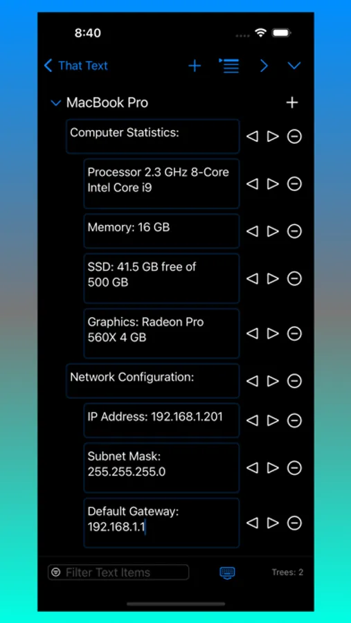 That Text allows for quick data entry into text fields. Group text content into navigable entries to easily organize content. Click on a Nav Item to bring up previous text entries fast. Edit or reorder content using built-in context menus. Text entries can be shifted left/right to simulate a parent/child tree-like structure. A powerful Filter field allows for fast filtering of content. Filtering can be toggled between filtering by Text entry or Tree name.