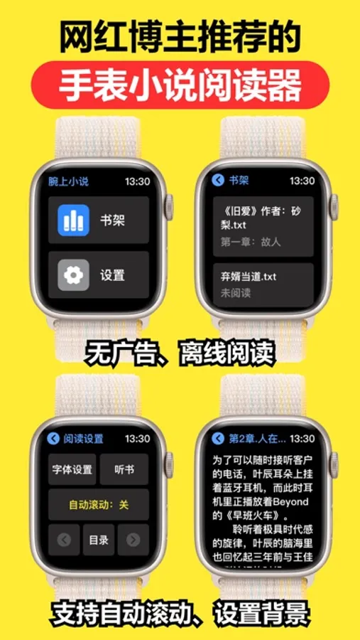 体积小,不占手机和手表空间,操作简单,功能实用,在手机本地添加小说同步即可。