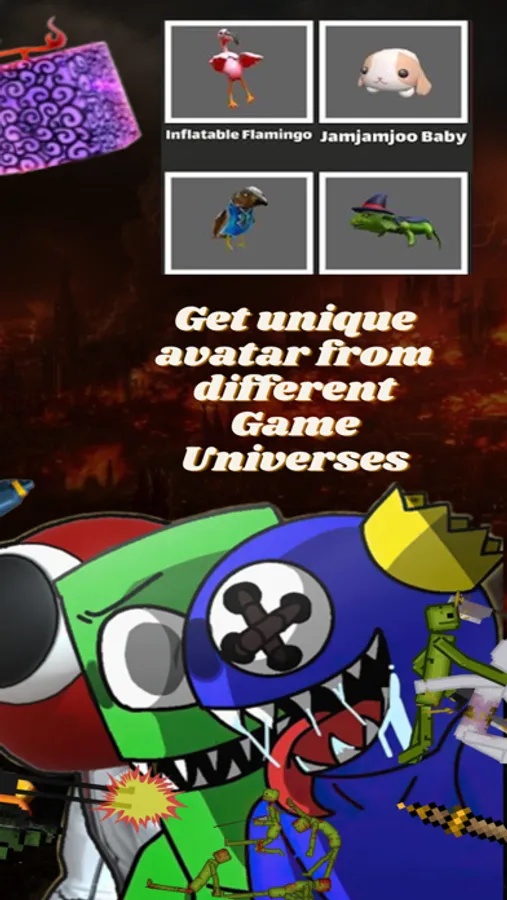 The whole Roblox 3D universe with Ghost, Ragdoll, pets, Skins, Shops, weapons, Blox fruits and cool items.