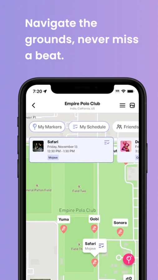 - Navigate with offline maps to locate stages, food, and facilities.