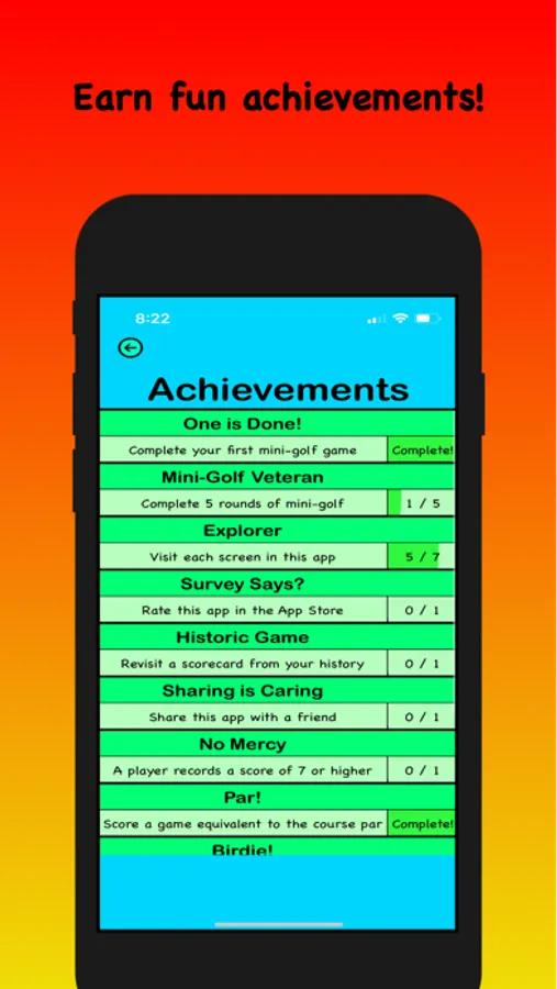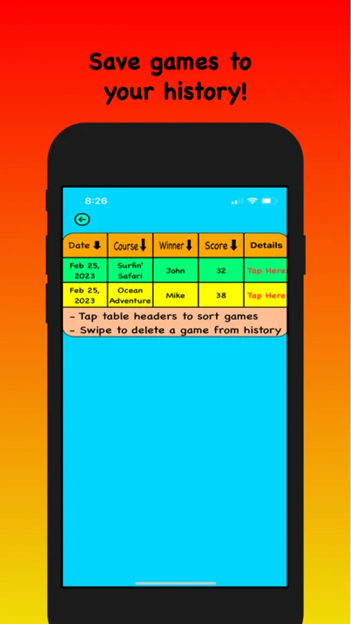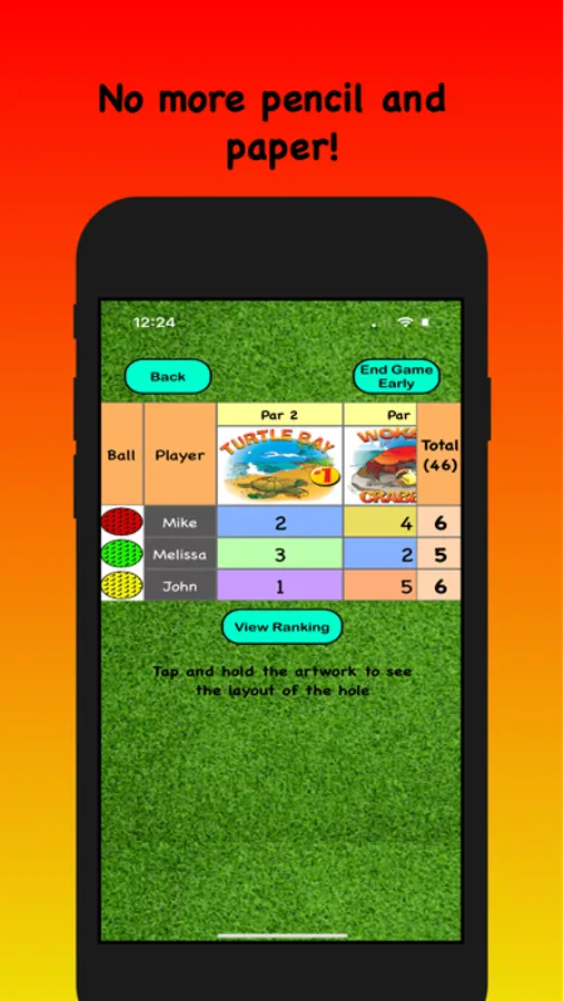 Easily keep score of all members in your mini-golf round, allowing you to spend less time keeping score, and more time focusing on your putts!