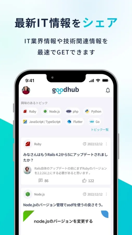 ITエンジニアのための究極のSNSアプリ、"goodhub"で最新情報をキャッチアップし、同じ業界の仲間と気軽に交流しましょう!