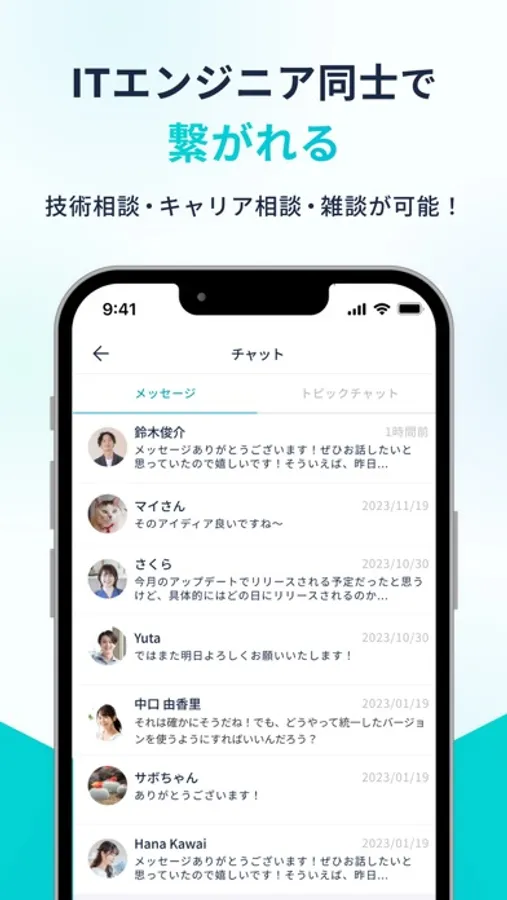 技術相談やキャリア相談、雑談など、同じ業界の仲間と気軽に交流できます。