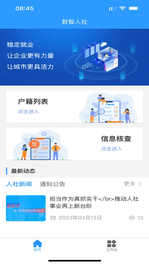 “数字人社”是基于“人力资源综合服务平台”下的移动端,主要应用于人力资源信息查询、统计和信息摸排,共同优化人社专项服务。