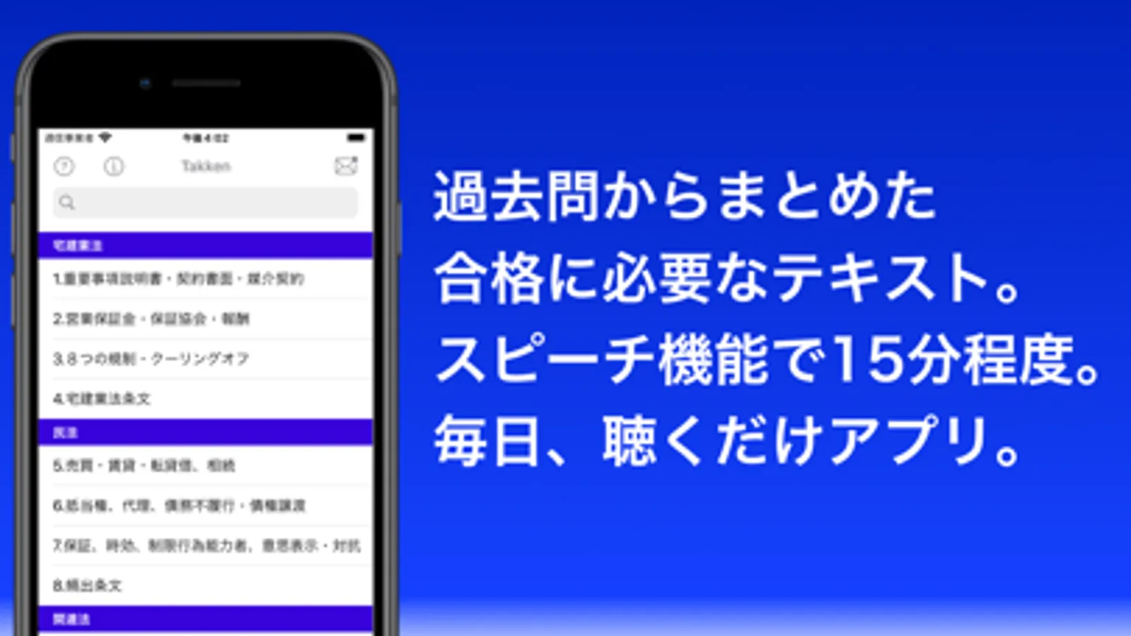 宅建の各科目を、15分程度のテキストにまとめています。スピーチ機能を使用して、手軽に勉強できるアプリを製作しました。