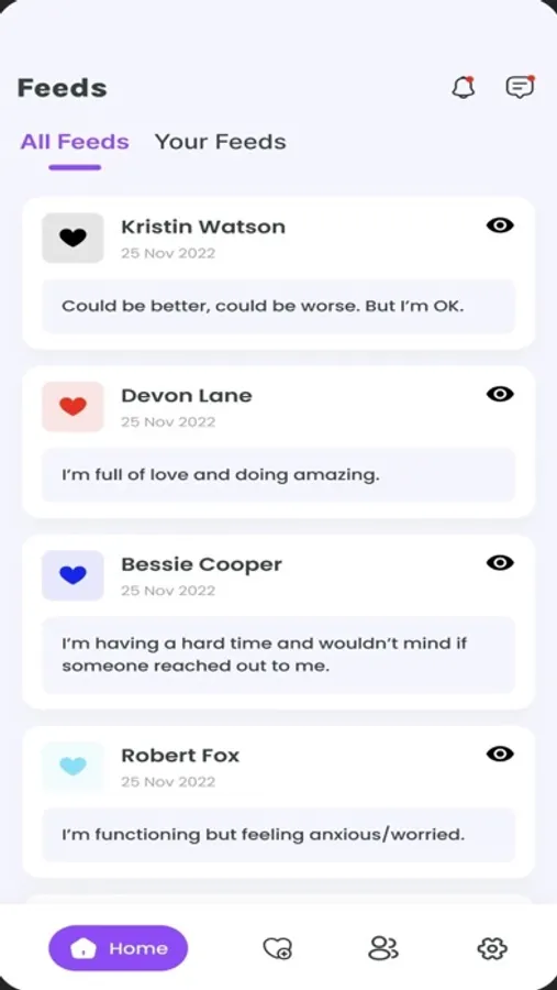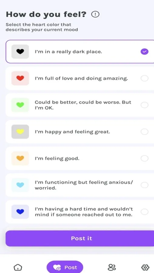 Check in on your friends' mental health and let them know how you're doing through the Support System app! Simply add your support network's emails and phone numbers and start interacting with their posts once they accept your friend request. You can interact with a post by clicking the "eye" button to notify the user you have seen their post and are available if they need a helping hand. Click on the "Support Network" tab to see a list of your friends and their respective current moods. You can make a post by selecting the heart color that corresponds to your current mood and clicking "Post It" to post to your feed. Each post is time and date-stamped so you have a history of your moods that you can easily share with a mental health professional. Support System App is not responsible for any actions taken through the app and is age-restricted to 18+ users; we do NOT collect any user data or share/sell your data.