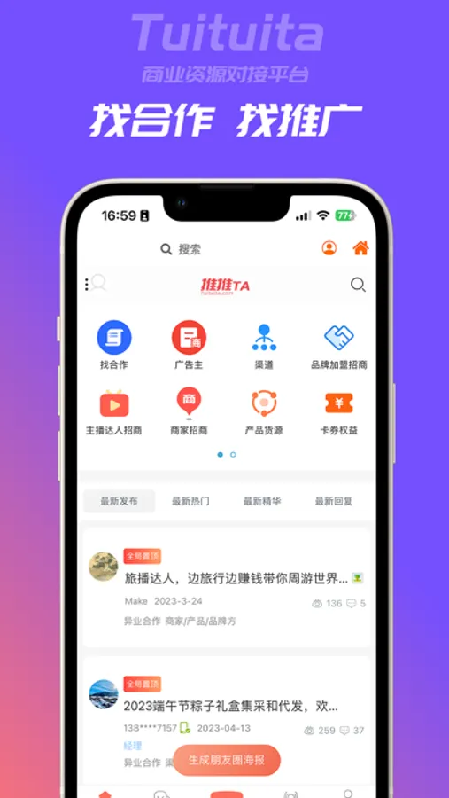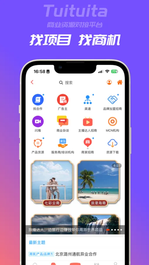 找合作、找渠道、找资源、找项目、找商机、找人脉、找推广,品牌代理加盟招商异业合作BD,电商产品找主播带货,APP拉新找线下地推团队。直播推广、短视频推广、微信推广、微博推广、自媒体推广、线上广告、线下广告社区资源、场地/卖场/商超地推联合活动