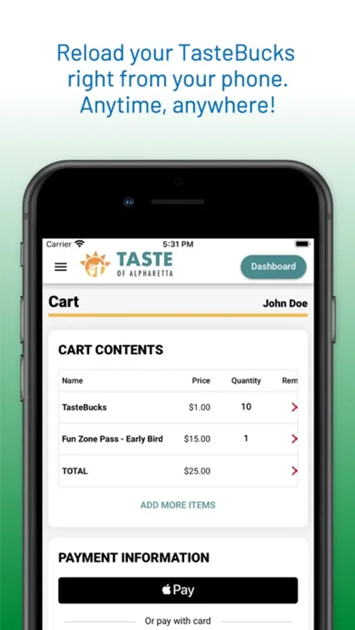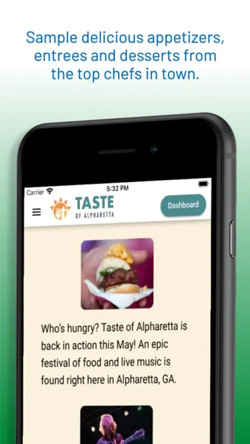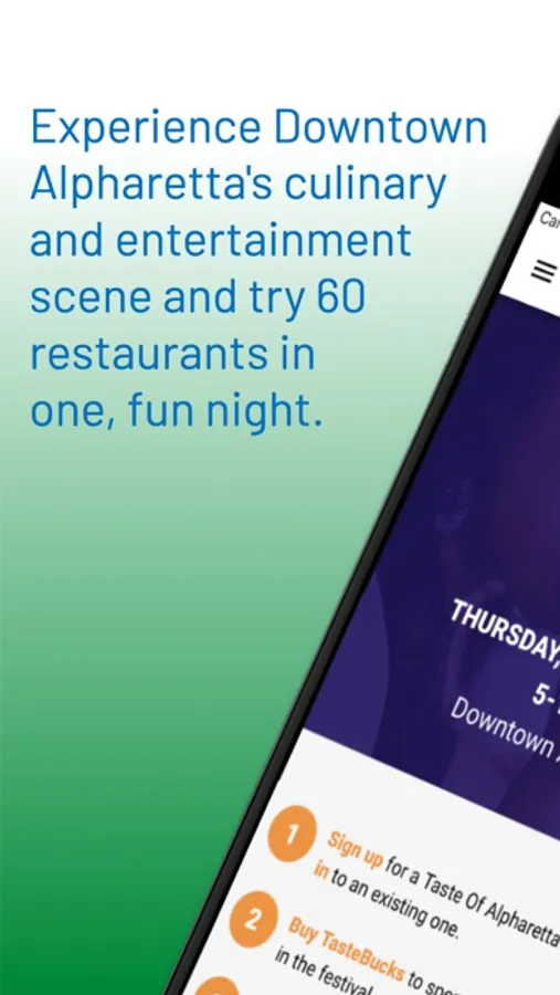 Download the app to purchase and redeem TasteBucks for food samples, drinks and fun zone access. Get live updates on programs, music lineup, culinary contests and other activities happening at the Taste of Alpharetta on Thursday, May 11, 2023 from 5-10 pm.