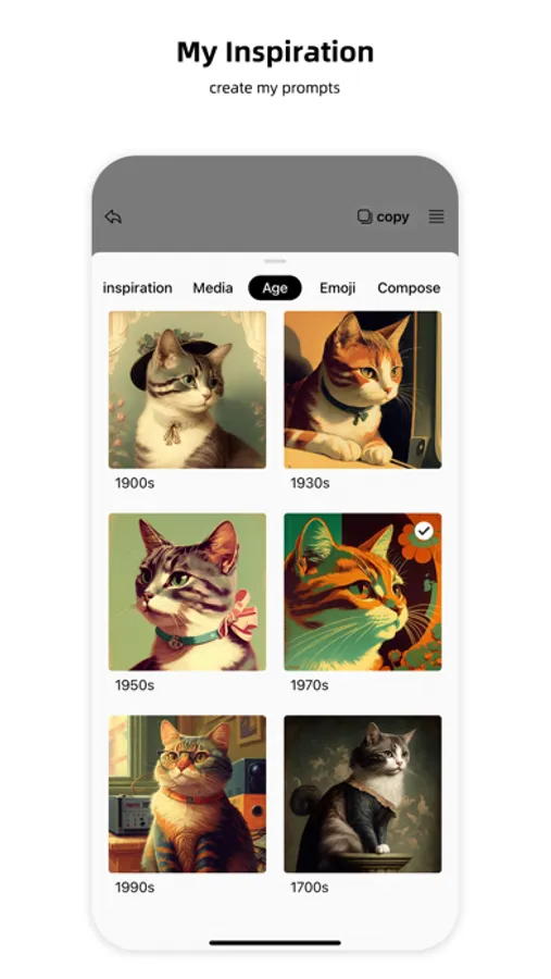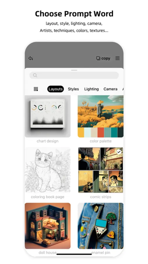 This app provides a variety of selectable prompts, currently including layout, style, lighting, camera, artist, technique, color, and texture modules. It will also continue to be updated with new prompt modules for use.