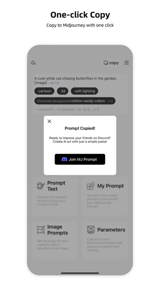 Once you've finished creating your artwork, you can copy the generated prompts to the Midjourney Discord channel and share your masterpiece with the world! Whether you're a digital artist or a beginner, MJ Prompt will be your trusted assistant. Download MJ Prompt now and start your AI art journey!