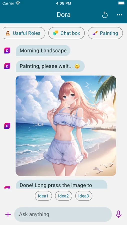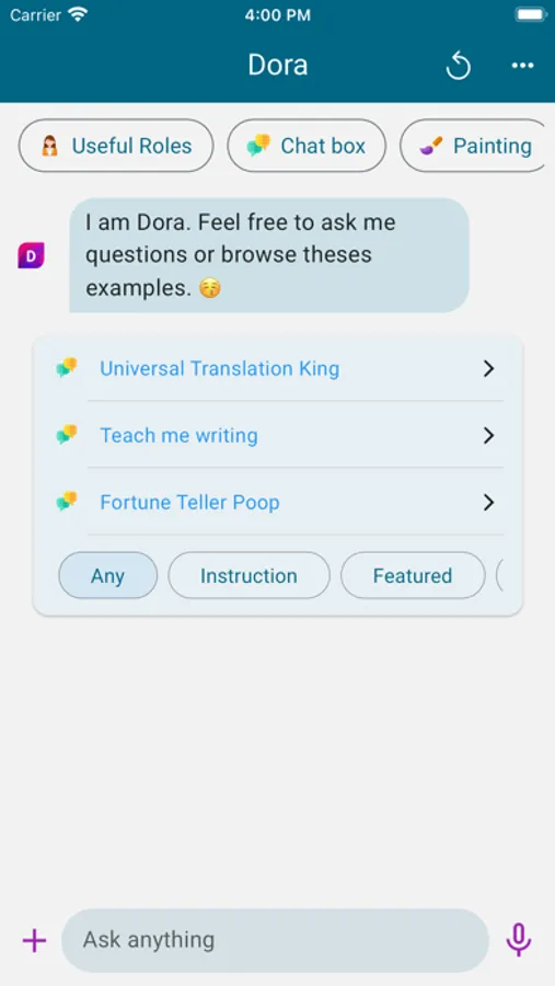 Dora is a friendly AI assistant that can help with everyday problems like answering questions, translating, language learning, grammar, or generating content and drawings you want. You can also chat with her freely.