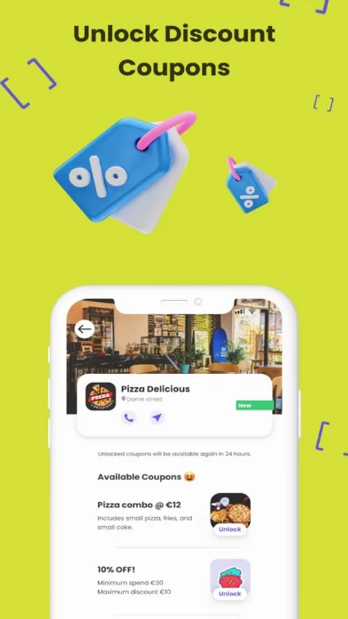 - Instantly unlock coupons for on-demand deals at restaurants, cafes, salons, and other stores.